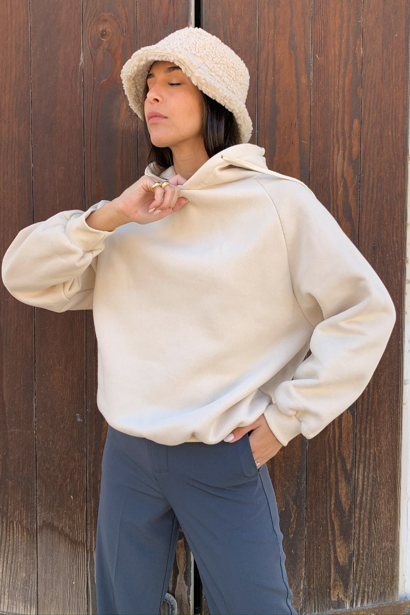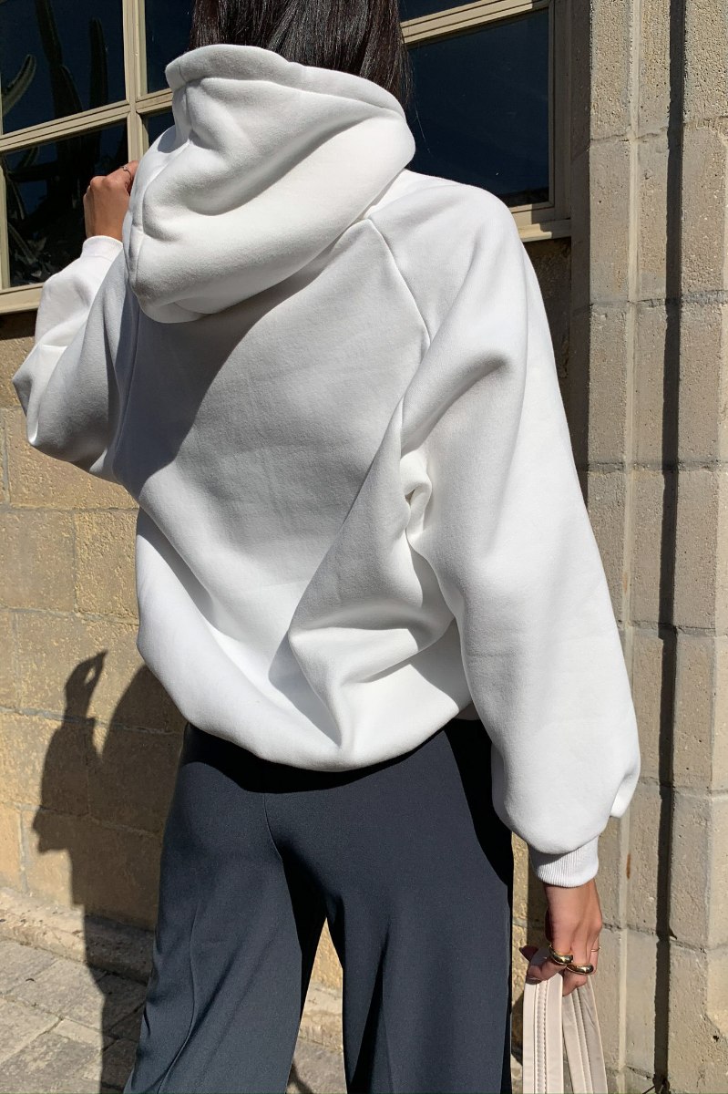 בגזרת אוברסייז משוחררת בשילוב כובע קפוצ׳ון